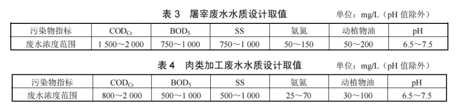 禽畜(包含雞鴨鵝牛羊豬等)屠宰廢水水質(zhì),以實(shí)際監(jiān)測(cè)數(shù)據(jù)為準(zhǔn)。無(wú)實(shí)際檢測(cè)數(shù)據(jù)時(shí),根據(jù)《屠宰與肉類加工廢水治理工程技術(shù)規(guī)范》規(guī)定,屠宰廢水水質(zhì)取值可參照表3,肉類加工廢水水質(zhì)取值可參照表4。